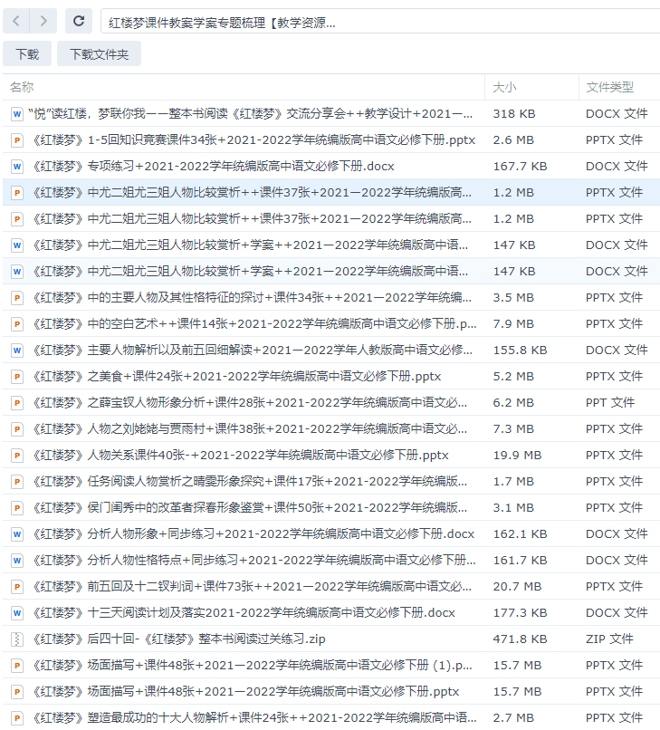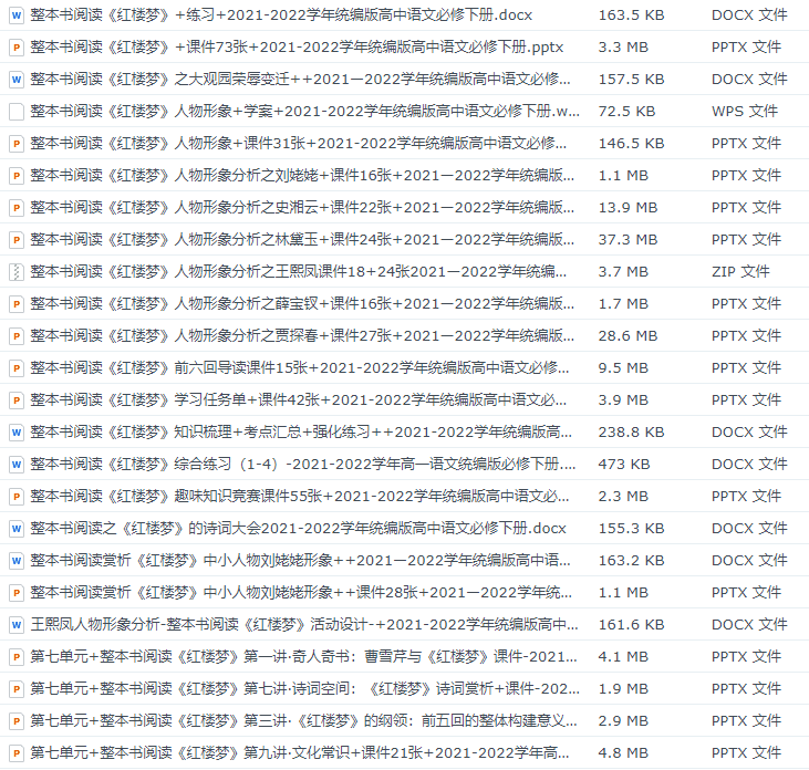 高中语文整本书阅读《红楼梦》教学资源集,包含导读、专题、人物、故事情节、过关练习、检测等。